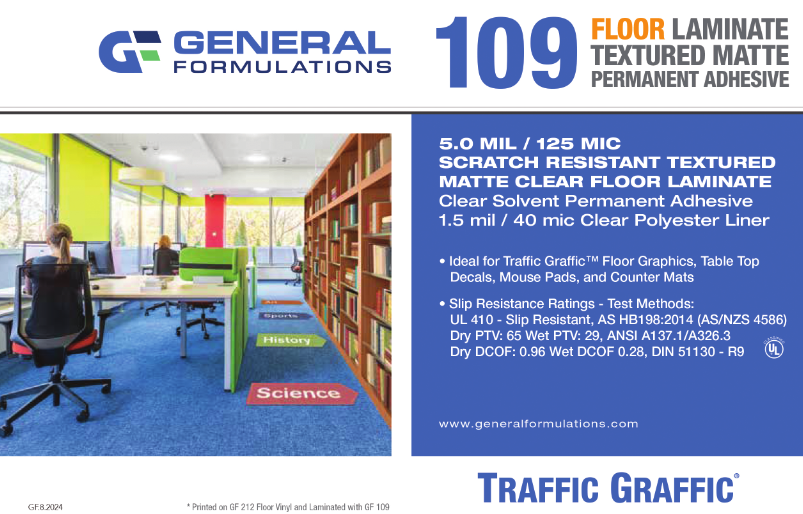 GF 109 is a 5.0 mil scratch resistant clear laminate with a textured matte finish. This laminating film is an inexpensive and durable alternative to polycarbonate film. It has a permanent acrylic pressure sensitive adhesive formulated for exceptional clarity. Produced on a 1.5 mil polyester clear liner, the laminate has an extremely smooth adhesive coating. GF 109 can be paired with approved print films to create graphics for tile and carpet. GF 109 has been rated for slip resistance based on multiple testing methods. UL 410 approved for slip resistance on interior floors and commercial carpets.