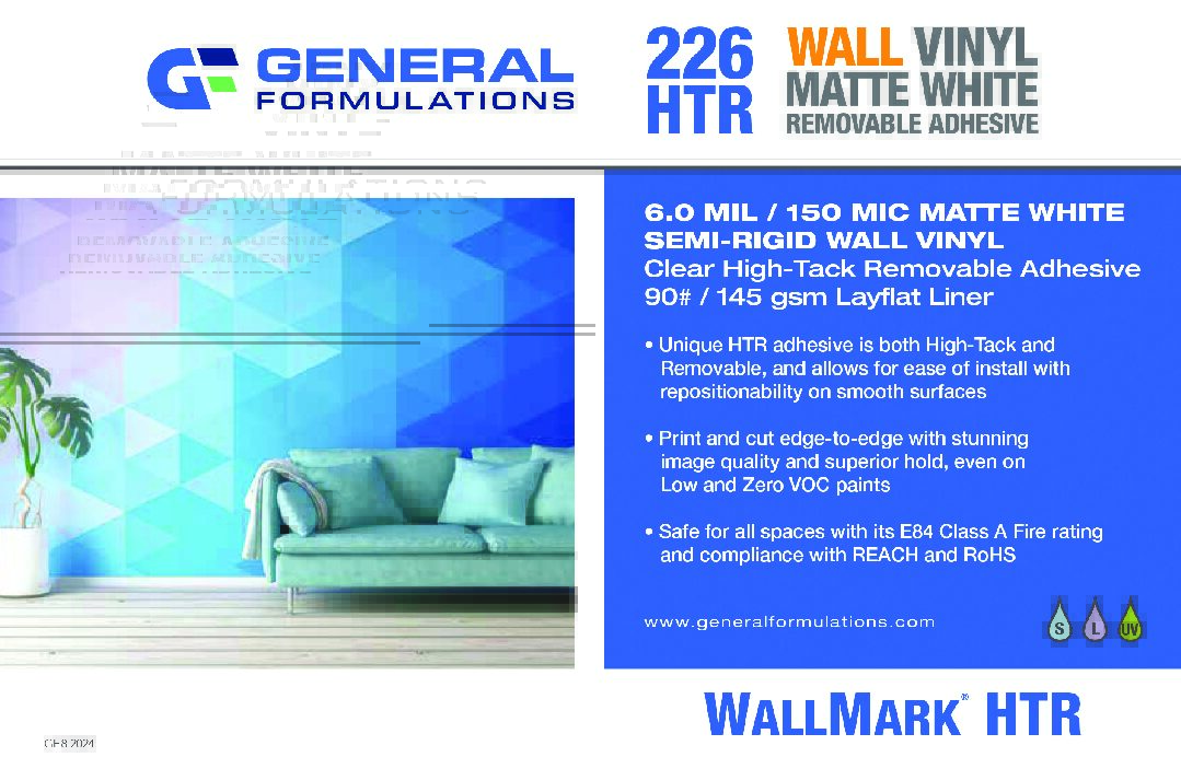 GF 226HTR is a 6.0 mil matte white semi-rigid vinyl. GF 226HTR has a unique and innovative pressure sensitive adhesive that is specially formulated to be both high-tack and removable (HTR). The combination of vinyl and adhesive is designed to stick aggressively to most surfaces, but is specially formulated to remove cleanly for up to a year. It’s also forgiving in the event you touch the adhesive to itself—it will separate cleanly and the adhesive stays anchored to the vinyl. The 90# tight release liner provides excellent stability for processing using solvent, latex and UV curable digital inks common to wide format digital printing.