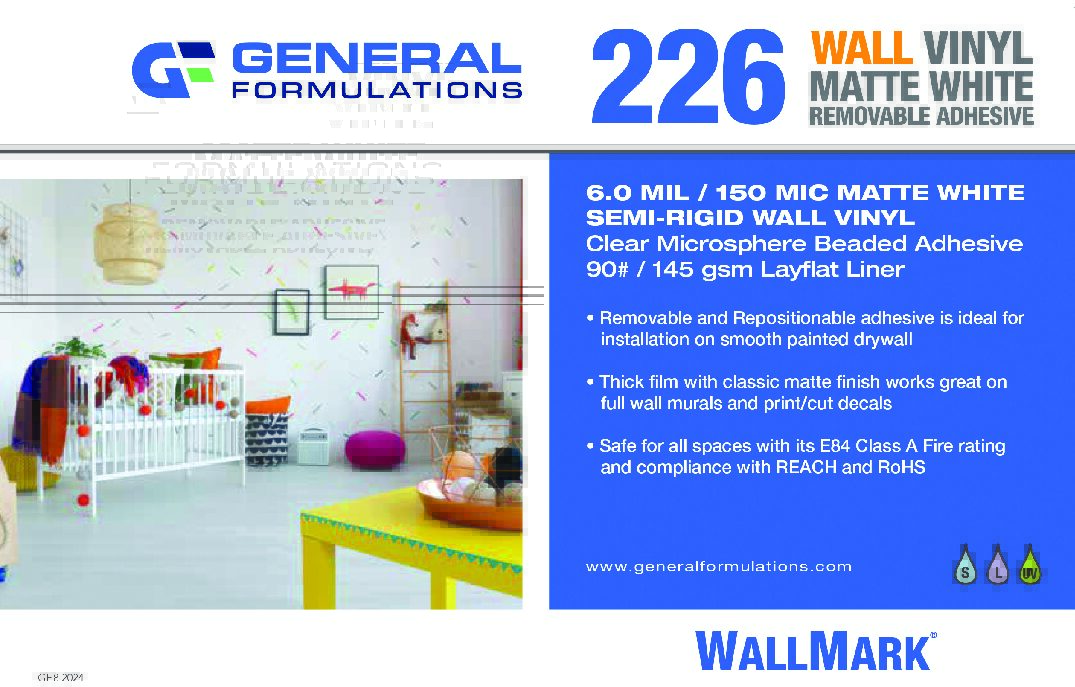 Concept 226 Removable Vinyl is a premium-quality, 6-mil matte calendered vinyl with a special, removable acrylic adhesive that’s ideal for interior graphics applications. The material adheres to flat, painted wall surfaces and most types of wallpaper and wood panels. With its clear, ultra-removable adhesive, WallFlair can be taken down easily without leaving a messy residue. This product is not intended for use on unfinished walls and must be applied on a dry surface. Printing to bleed is not recommended. To prevent the edges from lifting, a 1/8” to 1/4" border is recommended.